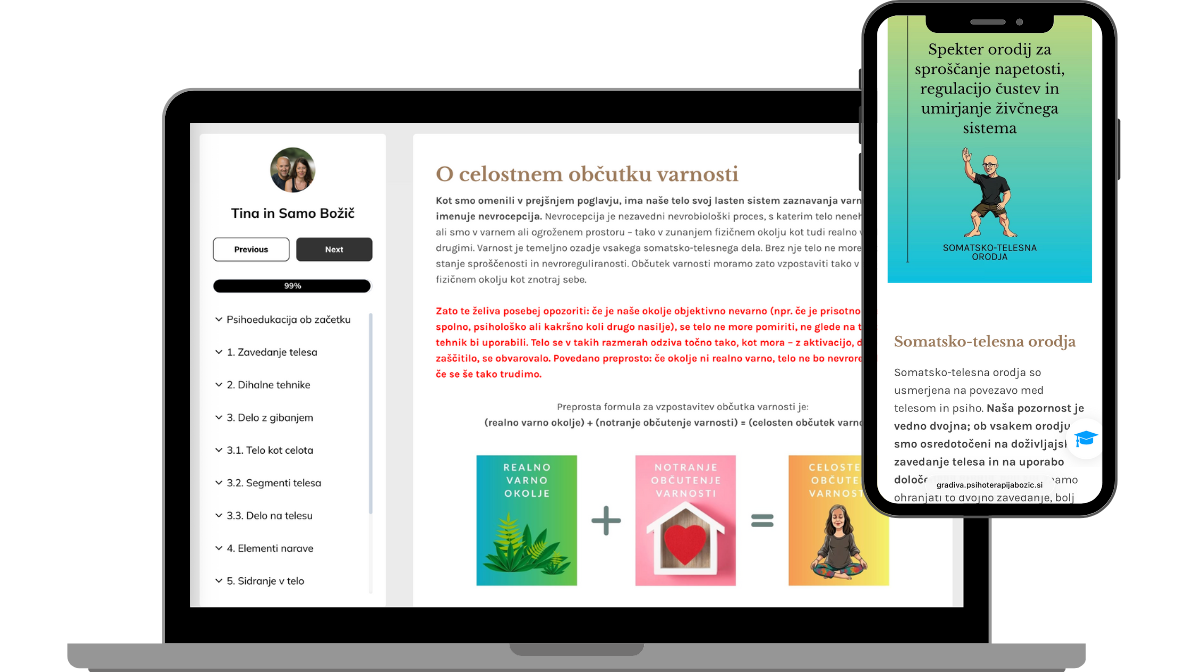 V ta online vodič sva premišljeno vključila zgolj tisto, kar se nama v praksi znova in znova izkaže kot nujno za samostojno delo: razumevanje telesnih odzivov ter preproste vaje in prijeme, ki jih je mogoče uporabljati v vsakdanjem življenju.